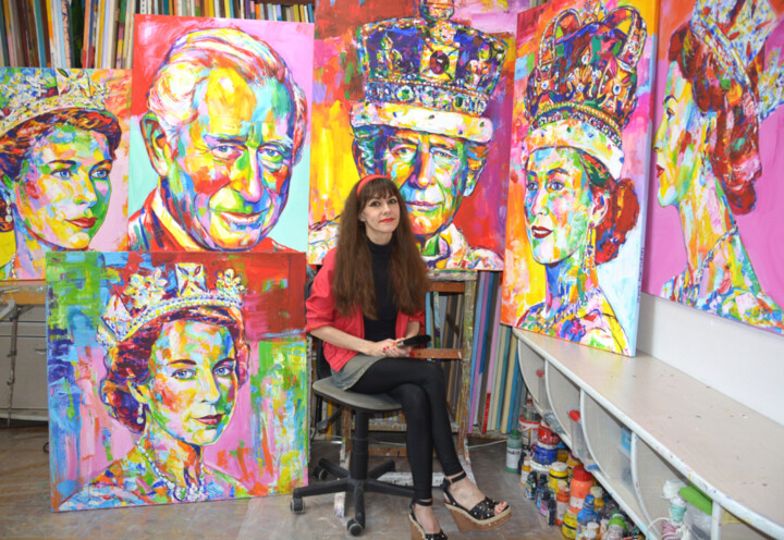 Работа, которую я пишу сегодня: Портрет короля Карла 3 в короне. Я использую одну из своих любимых техник: быстрое и спонтанное нанесение ярких, разноцветных акриловых красок на холст широкими кистями и лопаточкой, в стиле Поп-Арт.
