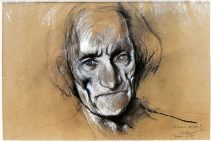 Artaud: Étude, Volet 1 du Diptyque — глубокий и завораживающий рисунок Эрнеста Пиньона-Эрнеста, созданный в 1997 году. Этот оригинальный этюд является важным предшественником трафаретной печати, которая позже была представлена на стенах больницы Шарля Фуа в Иври- sur-Seine, значимое место в жизни Антонена Арто. Картина представляет собой глубоко интроспективное и грубое изображение Арто, отражающее глубокие психологические и эмоциональные потрясения, которые он пережил во время своего интернирования. Тщательное внимание Пиньона-Эрнеста к деталям и эмоциональное использование уголь создает поразительное визуальное представление, которое резонирует с интенсивностью переживаний Арто. Как первая часть диптиха, этот этюд играет неотъемлемую роль в общем повествовании произведения искусства. Его невозможно полностью оценить или понять без его аналога, сопровождающего фотография, которая дополняет и усиливает тематическую глубину произведения. Диптих в совокупности представляет собой всестороннее исследование заключения и душевного состояния Арто, предлагая пронзительный комментарий о пересечении искусства, истории и личных страданий. Значимость рисунка еще больше усиливается его связью с физическим пространством больницы Шарля Фуа, где Арто Эти трудности стали символом более широких проблем, связанных с психическим здоровьем и уходом в учреждениях.