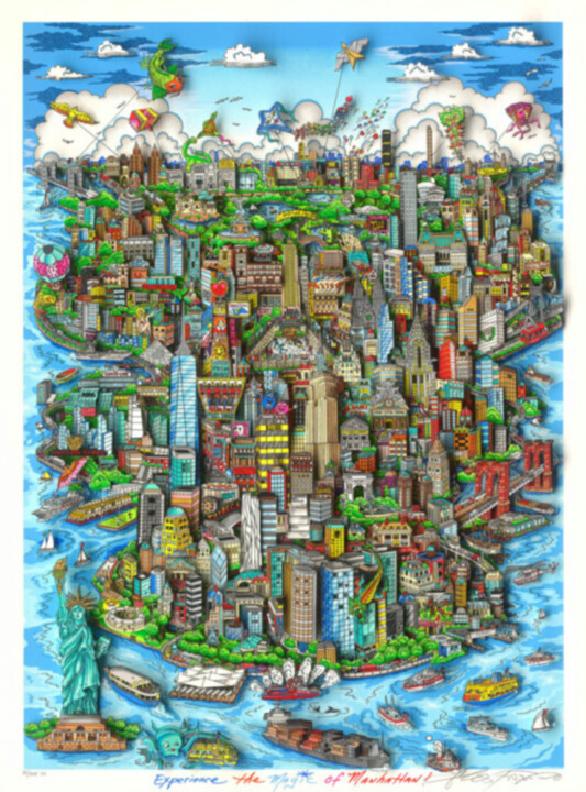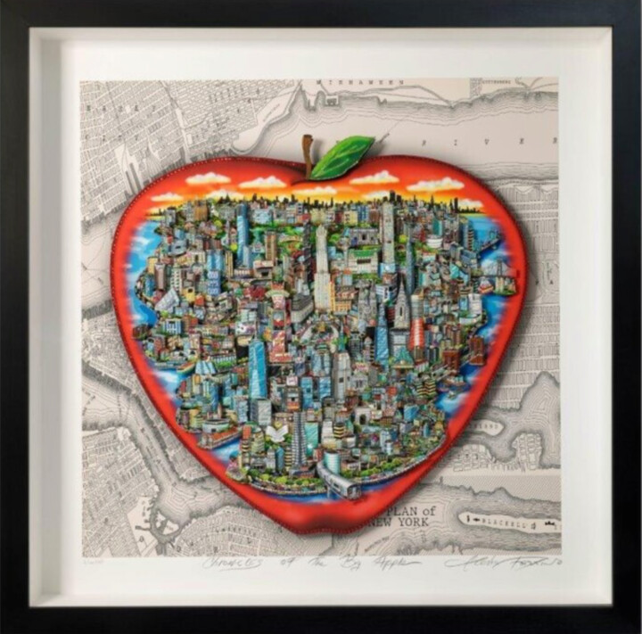 «Хроники большого яблока» (2019) — очаровательная скульптура Чарльза Фаццино, известного своим ярким 3D-поп-артом. Это произведение ограниченного выпуска, номер 7 из 150, создано из «Бумаги на бумаге» и демонстрирует фирменный стиль Фаццино, состоящий в замысловатых слоях и динамичной композиции. На картине изображен Нью-Йорк, ласково известный как «Большое яблоко», оригинально изображенный внутри большого красного яблока. Эта игривая игра слов и изображений придает произведению причудливый оттенок. На заднем плане карта Нью-Йорка обеспечивает контекст и глубину, создавая основу для шумного мегаполиса, запечатленного внутри яблока. Детальная визуализация Фаццино включает в себя множество высотных зданий, каждое из которых тщательно вырезано и наслоено для создания трехмерного эффекта. Скульптура ярко воплощает в жизнь энергию и динамизм Нью-Йорка, позволяя зрителям почти почувствовать пульс города. Это произведение искусства прославляет богатую историю Нью-Йорка, культовую архитектуру и разнообразные истории миллионов его жителей. В «Хрониках большого яблока» Фаццино мастерски передает суть Нью-Йорка в своем уникальном стиле поп-арт.