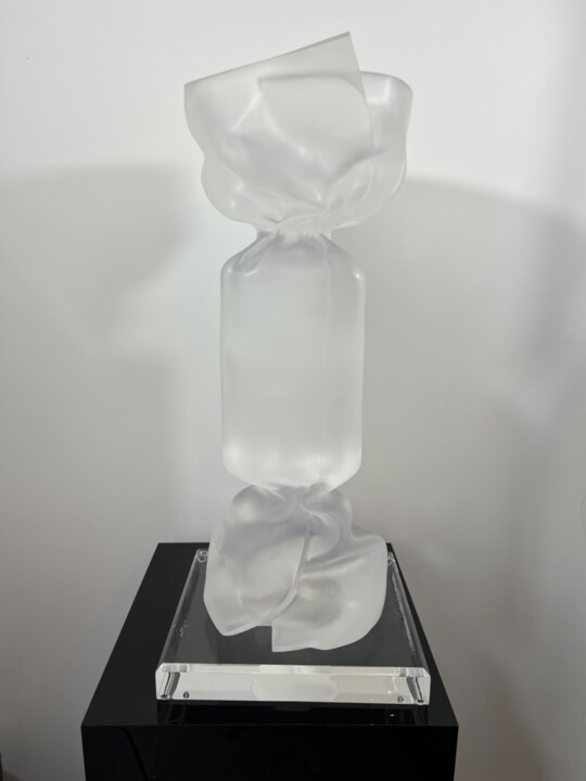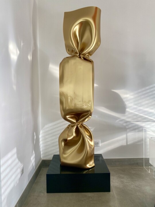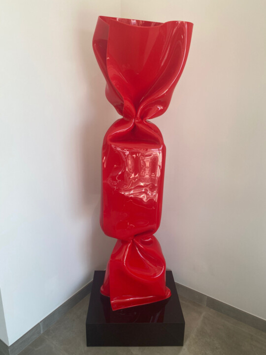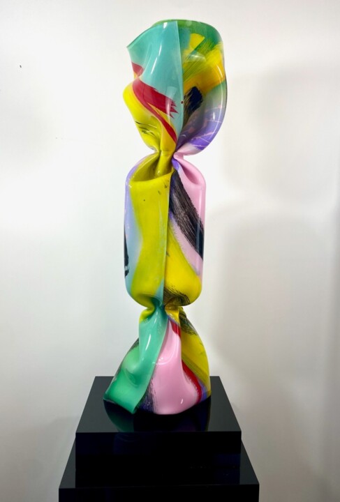 Мой любопытный ум побудил меня экспериментировать за пределами условностей. Детство, отмеченное отсутствием сладостей, вдохновило меня на смелую идею: использовать в своих работах настоящие конфеты. Я начал с того, что объединил их на холсте, создав соблазнительные и пикантные произведения, хранящиеся под футлярами из оргстекла. Затем, используя обрезки того же оргстекла, я нагрел его, скрутил и придал ему форму, чтобы вылепить «Конфету», какой я ее вижу сегодня. Современная интерпретация детских воспоминаний.