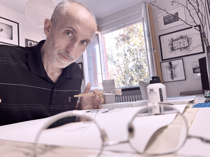 В моей домашней студии у меня есть различные пространства для размышлений, работы и обучения. Моя работа начинается с текста, синтезирующего художественное произведение, затем я беру исходные фотографии и начинаю их обрабатывать на компьютере. Иногда я также использую эскизы или предварительные распечатки, чтобы уточнить некоторые последующие шаги. После первого «прототипа» я вхожу в своего рода цикл: начинаю пересматривать текст, чтобы лучше определить эстетические и эксплуатационные аспекты, а также совершенствую производственную и пост-продакшн. Рабочий процесс следует образцу мелодии, с максимумами и минимумами, паузами, яркими и спокойными моментами. Я считаю, что почти невозможно работать без хорошей музыки.