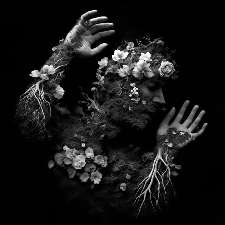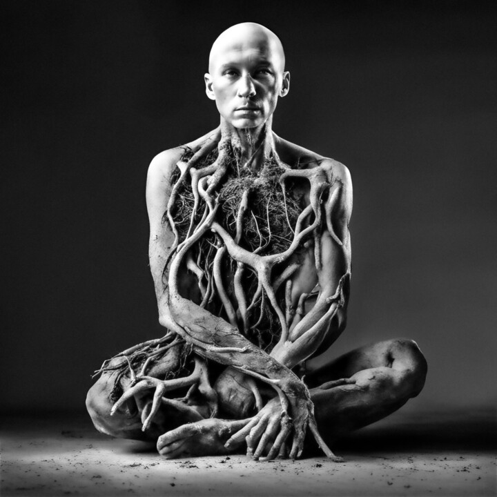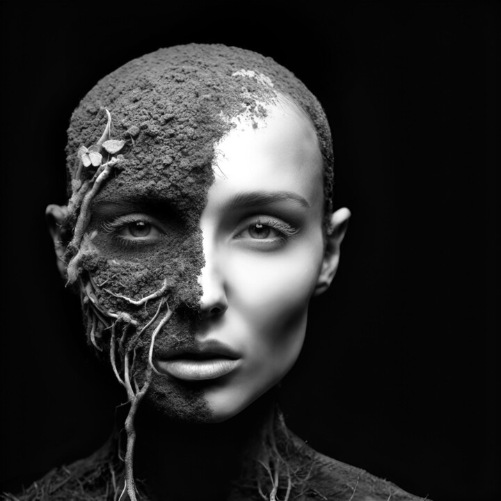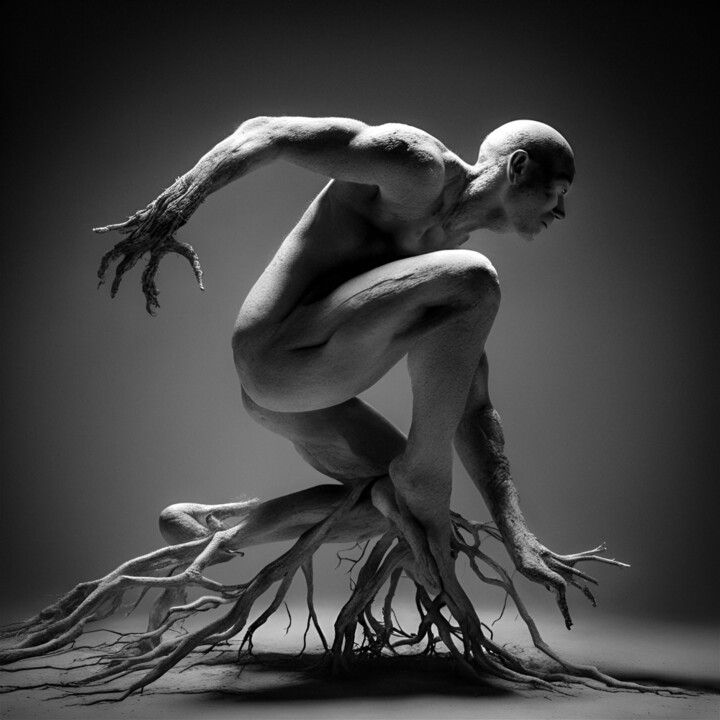 Тема моего последнего художественного произведения – размышление между Землей и Человечеством, партнерство, которое, кажется, было прервано, разорвано. Я задумал воссоздать образы человеческих фигур, состоящих исключительно из земли, корней и другого мелкого мусора. Здесь человеческая фигура обретает форму благодаря молчаливой работе корней, посредством медленного построения, направляемого древним песнопением, своего рода первобытной энергией, из которой постепенно произошли и земля, и люди. Стилистически я выбрал темный тон, чтобы создать визуальный сдвиг между реальным миром и нашим восприятием, испорченным отказом соединиться с природой. Это источник этих тревожных видений, рожденных из-за неспособности распознать и принять наше самое подлинное происхождение. Чтобы лучше гармонизировать эти изображения, я решил использовать методы построения, начиная с искусственных агентов, сохраняя при этом строгий формальный контроль результатов, чтобы гарантировать правильное фотографическое качество. Эта работа также дает жизнь новой книге художника с изображениями и словами в форме истории.