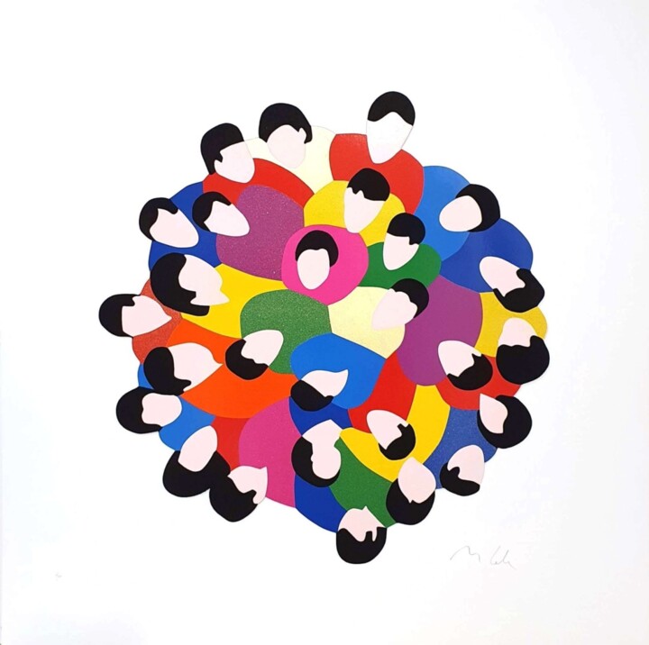 Описание и интерпретация: «Большие объятия» изображают яркую круглую группу упрощенных человеческих фигур, подчеркивающую чувство единства и коллективных объятий. Перекрывающиеся формы и яркие контрастные цвета передают ощущение единения и тепла. Отсутствие детальных черт лица позволяет зрителю сосредоточиться на общей композиции и эмоциях, которые она вызывает, а не на отдельных личностях.