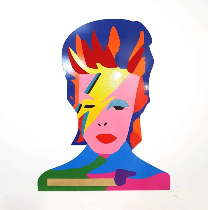 Это яркое и динамичное произведение под названием «BOWIE», созданное в 2014 году Марко Лодолой, является свидетельством его своеобразного эстетического и новаторского подхода к современному искусству. Это произведение представляет собой сериграфию, тип печати, в котором используются несколько слоев и техник для достижения уникальной текстуры и визуального воздействия.