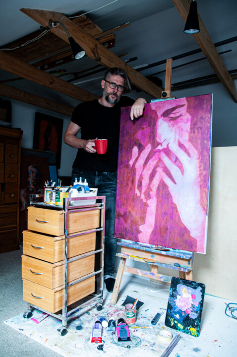 Процесс создания моих работ также прост. Я всегда начинаю с эскизов на бумаге. Затем я выбираю один и переношу его на холст. Рисуя, я позволяю себе некоторую свободу, я больше не придерживаюсь строго исходного эскиза. Во время работы между мной и картиной происходит своего рода дискуссия. Я никогда не знаю, каким будет окончательный результат.