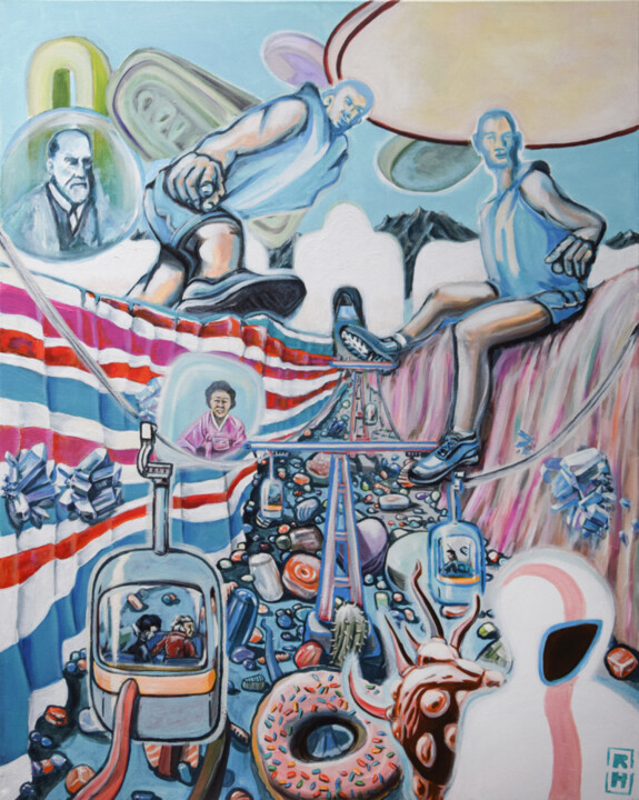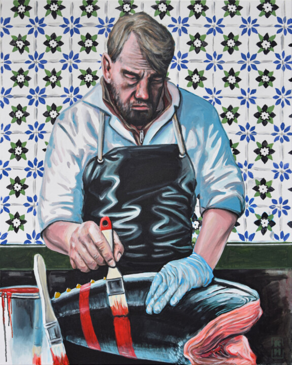 Как и многие из моих картин, моя текущая появляющаяся картина — это ретро с абсурдным, отчуждающим настроением. Две почти одинаковые женщины за прилавком, кажется, подают зрителю весьма своеобразный товар. Это не поддающаяся определению смесь органов, кораллов или минералов, выложенных в виде какого-то желе или жидкости. На заднем плане мужчины, которые, кажется, поглощены работой. Впереди одна из сущностей лежит на земле. Внешне здесь просматривается дружелюбный аспект, но в то же время с ним связано жуткое чувство. Настроение «старых добрых дней» вкупе со зловещими событиями современности — одна из моих любимых тем.