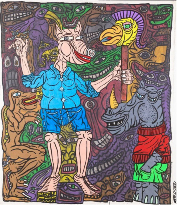 Le Perroquet Grec Marotte Raconteur , картина Роберта Комбаса, созданная в 1986 году, иллюстрирует его фирменный стиль Figuration Libre. В этой яркой и динамичной работе изображена центральная фигура, напоминающая свинью, одетую в человеческую одежду, с посохом, символизирующим власть. Вокруг этого центрального персонажа изображены различные другие животные, каждое из которых выполнено в характерном для Комбаса сочетании смелых линий, ярких цветов и игривых форм. Композиция живая и причудливая, каждый элемент которой вносит свой вклад в повествование, которое кажется одновременно хаотичным и связным. Использование Комбасом ярких, контрастных оттенков и сложной детализации приглашает зрителей в фантастический мир, отражая его уникальную способность объединять популярную культуру, мифологию и личное воображение в уникальный, захватывающий визуальный опыт.