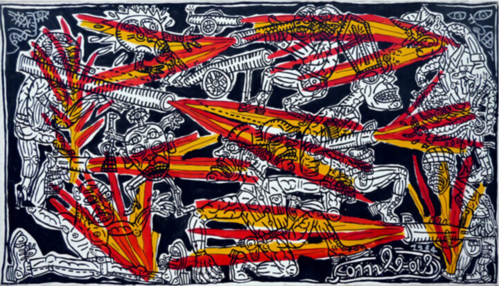 Картина Bataille à Coups de Feu Allongés, Ambiance Caramba Colorée , написанная Робертом Комбасом в 1984 году, является ярким примером его самобытного стиля Figuration Libre, передающего хаос и интенсивность битвы. На холсте преимущественно преобладает глубокий черный фон, который резко контрастирует с белыми линиями, подчеркивающими динамичные формы и формы изображенных персонажей. Эти персонажи втянуты в жестокий конфликт, стреляют друг в друга и бегут в отчаянной борьбе за выживание, создавая сцену, которая кажется одновременно хаотичной и очень оживленной. Темный и агрессивный тон картины подчеркивается использованием художником ярких брызг красного и желтого цветов, которые прорезают холст, придавая композиции ощущение актуальности и жизни. Эти яркие цвета добавляют динамичный элемент к мрачной палитре, подчеркивая жестокость и энергию изображенной сцены. Контраст между черным фоном и яркими цветами притягивает взгляд зрителя к холсту, подчеркивая происходящее безумное действие. Стиль Комбаса в этой картине представляет собой смесь арт-брют (аутсайдерского искусства) и свободной фигурации, отражающую его уникальный подход к искусству, бросающий вызов общепринятым нормам. Использование им грубых, выразительных линий и смелых цветов говорит о влиянии обоих этих движений, а также демонстрирует его личное художественное видение. Фигуры на картине изображены одновременно абстрактно и очень выразительно, передая ощутимое ощущение движения и эмоций. Название « Bataille à Coups de Feu Allongés, Ambiance Caramba Colorée » предполагает повествование, наполненное продолжительной стрельбой и красочной атмосферой хаоса, идеально отражающее изображенную сцену. Способность Комбаса сочетать повествовательные и абстрактные элементы приводит к созданию произведения, одновременно визуально поразительного и глубоко вызывающего воспоминания. Добавляя индивидуальности картине, подпись художника можно найти в правом нижнем углу холста, плавно вписываясь в композицию. Эта тонкая подпись служит напоминанием о руке Комбаса в создании этого яркого изображения конфликта, еще больше подчеркивая личностное выражение, присущее его работам. «Bataille à Coups de Feu Allongés, Ambiance Caramba Colorée» является свидетельством способности Роберта Комбаса передавать суматоху и интенсивность человеческого опыта посредством своего самобытного и мощного художественного языка.