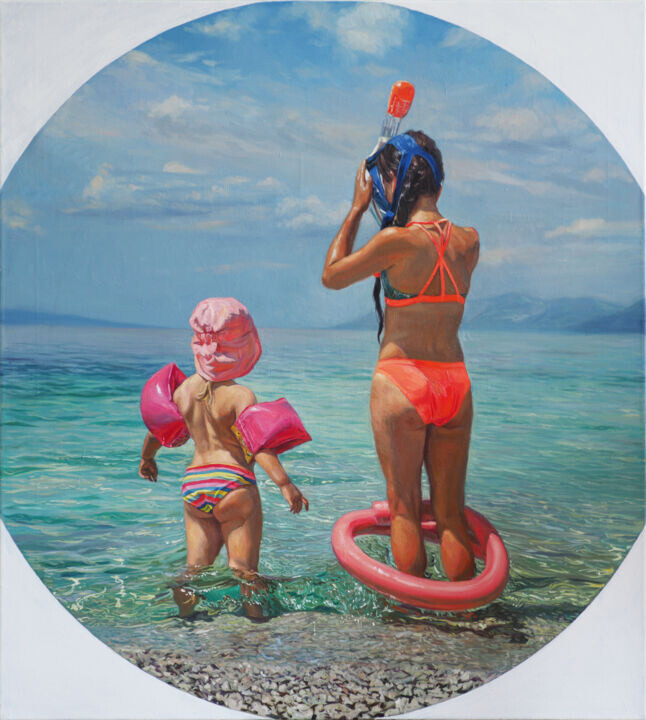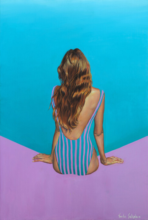 Мой последний сериал называется «Боги Солнца». Я рисовал русских людей на пляже, наслаждающихся последними солнечными днями перед бурей. Я использую высокий контраст между их телами, освещенными вечерним солнцем, и темно-синим небом. Эта серия реалистична, но фигуры выглядят большими, напоминая мне о богах, поскольку я намеренно опускаю горизонт. Я люблю формы тела, реальных людей и подобные ритуалы поклонения солнцу, отчаянно пытаясь поймать последние лучи солнца.