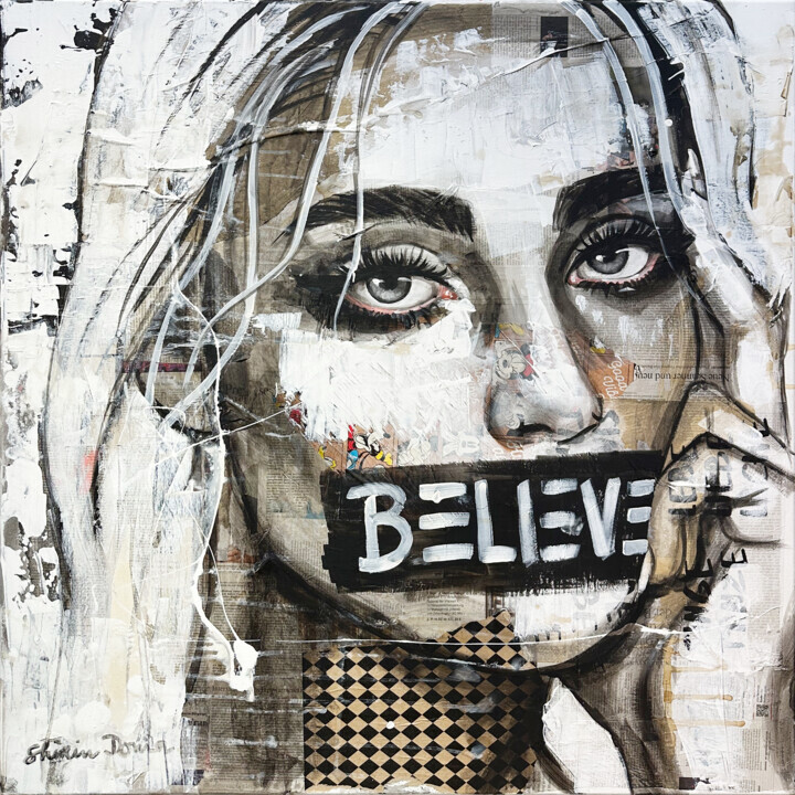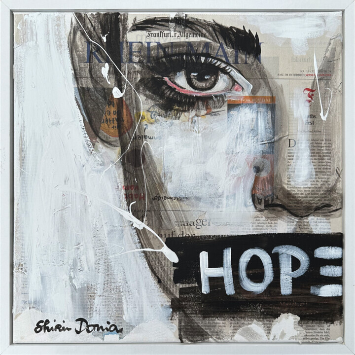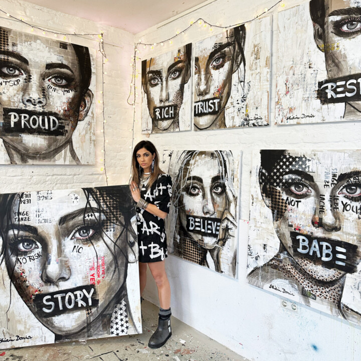Процесс создания моих работ начинается с разработки моей музы, которая будет главным субъектом. Я создаю этого человека в цифровом виде и выбираю вымышленного человека, который излучает для меня внутреннюю и внешнюю красоту. Затем я начинаю оформлять холст, накладывая несколько слоев разных материалов. Затем я грубо рисую лицо человека на холсте, а затем работаю над ним все более и более подробно. Наконец, если необходимо, я добавляю другие элементы смешанной техники и выбираю слово или текст, которые я пишу на картине, и тем самым подчеркиваю свое художественное высказывание.