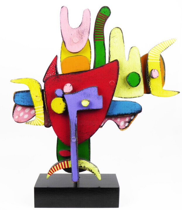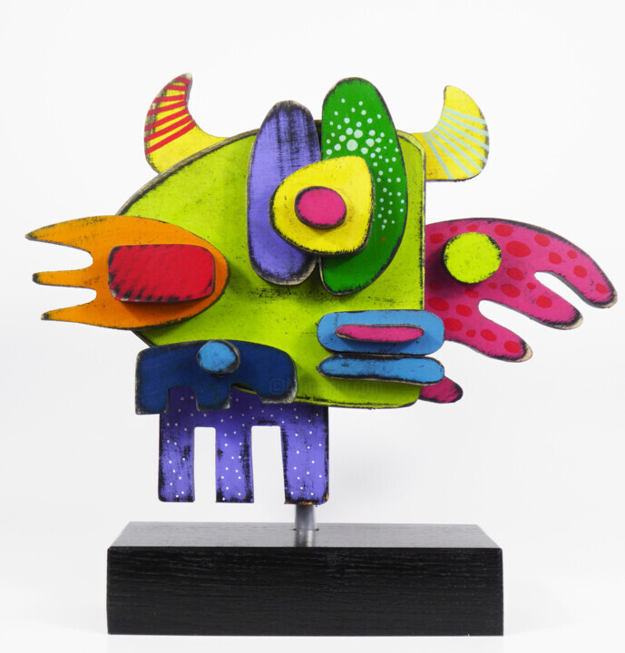 Чуткий к экологическим проблемам, я стараюсь как можно больше работать с предметами вторичной переработки, такими как старые картонные коробки, обрезки древесины и различные предметы, предназначенные для скрапа, которые будут использоваться, в том числе, в качестве трафаретов при реализации картин и сборке скульптур.