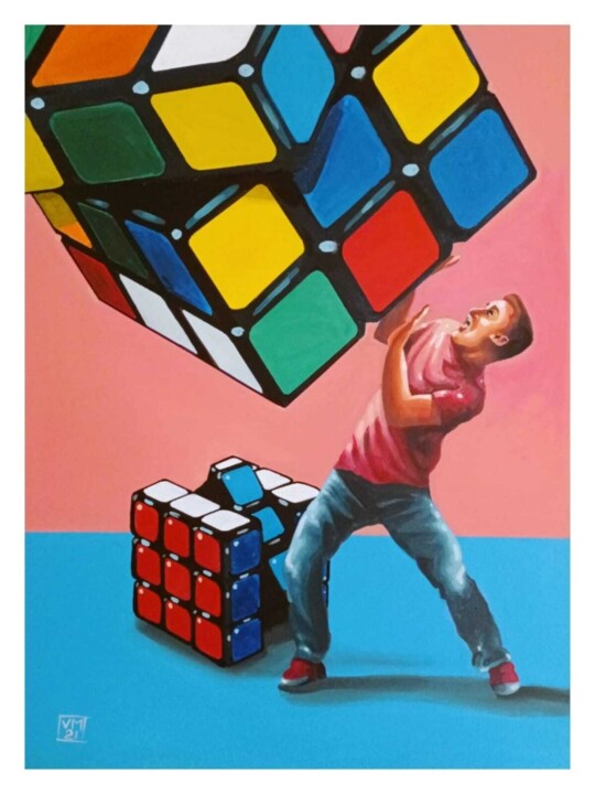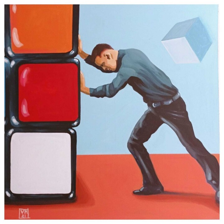 В «Панической атаке» (2021) Марино изображает момент всепоглощающей тревоги с помощью сюрреалистического преувеличения. Огромный падающий кубик Рубика грозит раздавить человека, уже окруженного другими головоломками — нерешенными, хаотичными и внушительными. Его выражение лица — выражение ужаса и беспомощности. Куб, культовый символ логики и контроля, здесь становится силой паники и беспорядка. Картина блестяще визуализирует парадокс попытки «решить» жизнь, когда детали слишком тяжелы, чтобы их нести.