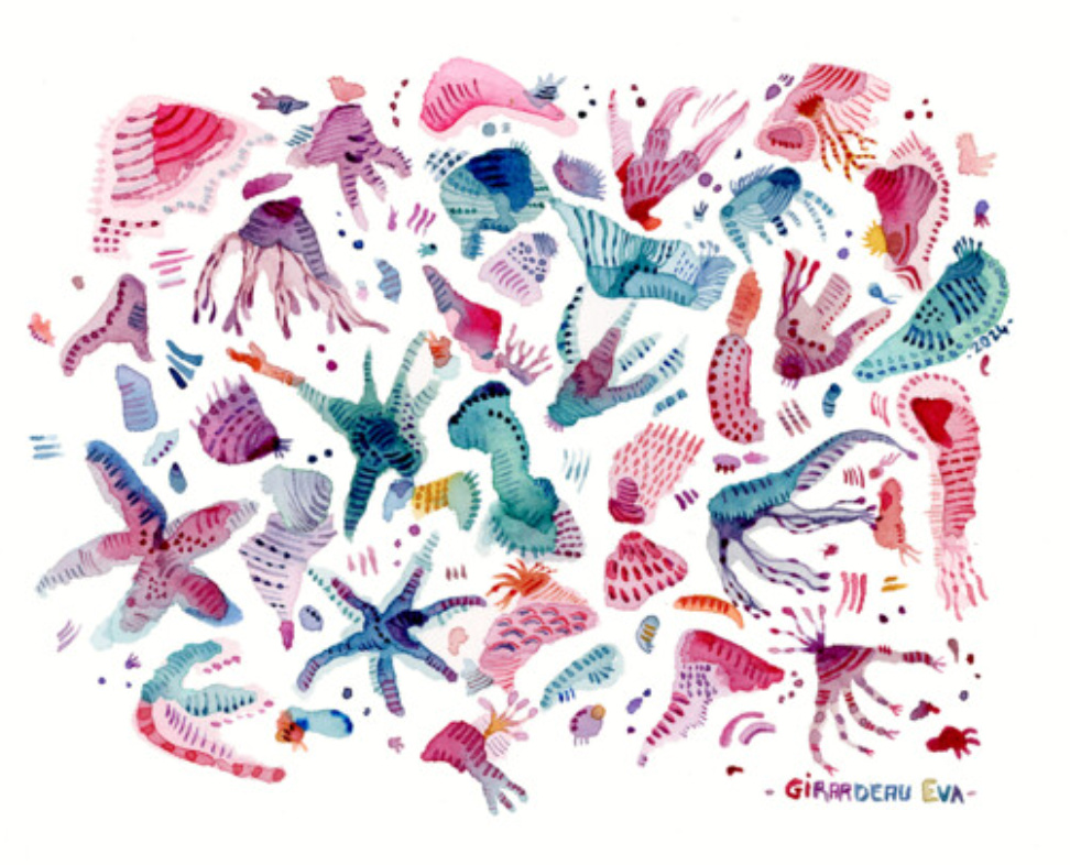 Да, меня вдохновляют многие художники. Известные художники, такие как Кандинский, Хильма аф Клинт, Миро и Соня Делоне. Современные иллюстраторы, такие как Брехт Эвенс и Джин Маллард, чья современная акварель мне очень нравится. Художник Симон Бюре, чья творческая вселенная наполнена красотой, будь то музыка или живопись. А также поэзия Бодлера и даже некоторые музыкальные коллективы, которых слишком много, чтобы перечислить всех.