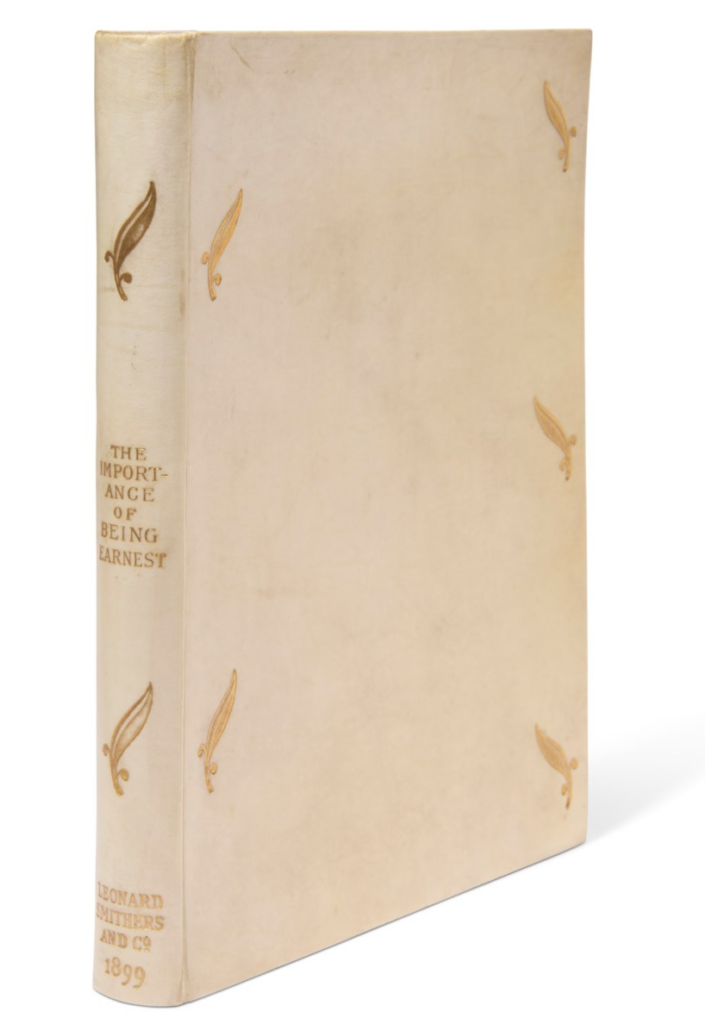 Чрезвычайно популярная пьеса Уайльда, названная У. Х. Оденом «чисто словесной пьесой», получила широкое признание в лондонском театре Сент-Джеймс 14 февраля 1895 года, но была снята после 86 представлений после его ареста и, как следствие, тюремного заключения Уайльда по обвинению в непристойном поведении. о его неудавшемся иске о клевете против лорда Куинсбери, отца любовника Уайльда, лорда Альфреда Дугласа. Этот экземпляр посвящен Леонарду Смитерсу, одному из самых новаторских и влиятельных печатников того периода. Смитерс был одним из небольшой группы издателей, которые, по словам Роберта Скоулза, «оказали большое влияние на развитие британской литературы на рубеже веков». Среди этих новых литературных издателей Смитерс был самым смелым, храбрым и, в некоторых отношениях, самым умным и талантливым из всех […] Годы между 1895 и 1900 годами были годами славы Смитерса. В течение тех пятидесяти лет после ареста и заключения Оскара Уайльда… Смитерс сумел опубликовать серию книг и журнал, посвященный литературе и искусству, которые с тех пор оказались последним и величайшим воплощением искусства и литературы – разума и духа – эстетического подхода. и декадентские движения, достигшие кульминации в XNUMX-е годы […] Публикация произведений авангарда в XNUMX-е годы была опасным предприятием, но Смитерс не уклонялся от него. У него не было ничего, кроме презрения к узкой и зачастую лицемерной морали того времени, и во многих случаях он демонстрировал свою готовность бросить вызов силам патриархальной власти и пуританскому фанатизму, одолевшим Уайльда.