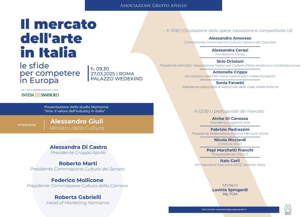 Рынок произведений искусства вносит значительный вклад в благосостояние нашей страны. — заявил он Алессандра Ди Кастро, президент Apollo Group – Однако мы должны признать, что мы все еще далеки от полного раскрытия своего потенциала. Если бы мы снизили ставку НДС до 5%, даже ниже, чем во Франции, Италия могла бы занять позицию центра по операциям купли-продажи. Это позволило бы одновременно защитить всю экосистему культуры, придавая ценность всем ее участникам.”. Пока он комментировал Роберта Габриэлли, Менеджер по маркетингу в Nomisma Несомненно, разный налоговый режим представляет собой реальную проблему, поскольку существует риск того, что итальянская система искусства будет постепенно терять конкурентоспособность, обедняться структурно и терять операторов, художников, навыки и перспективы. Речь идет не только о защите экономического сектора, но и о защите культурного оплота, который имеет основополагающее значение для идентичности нашей страны».